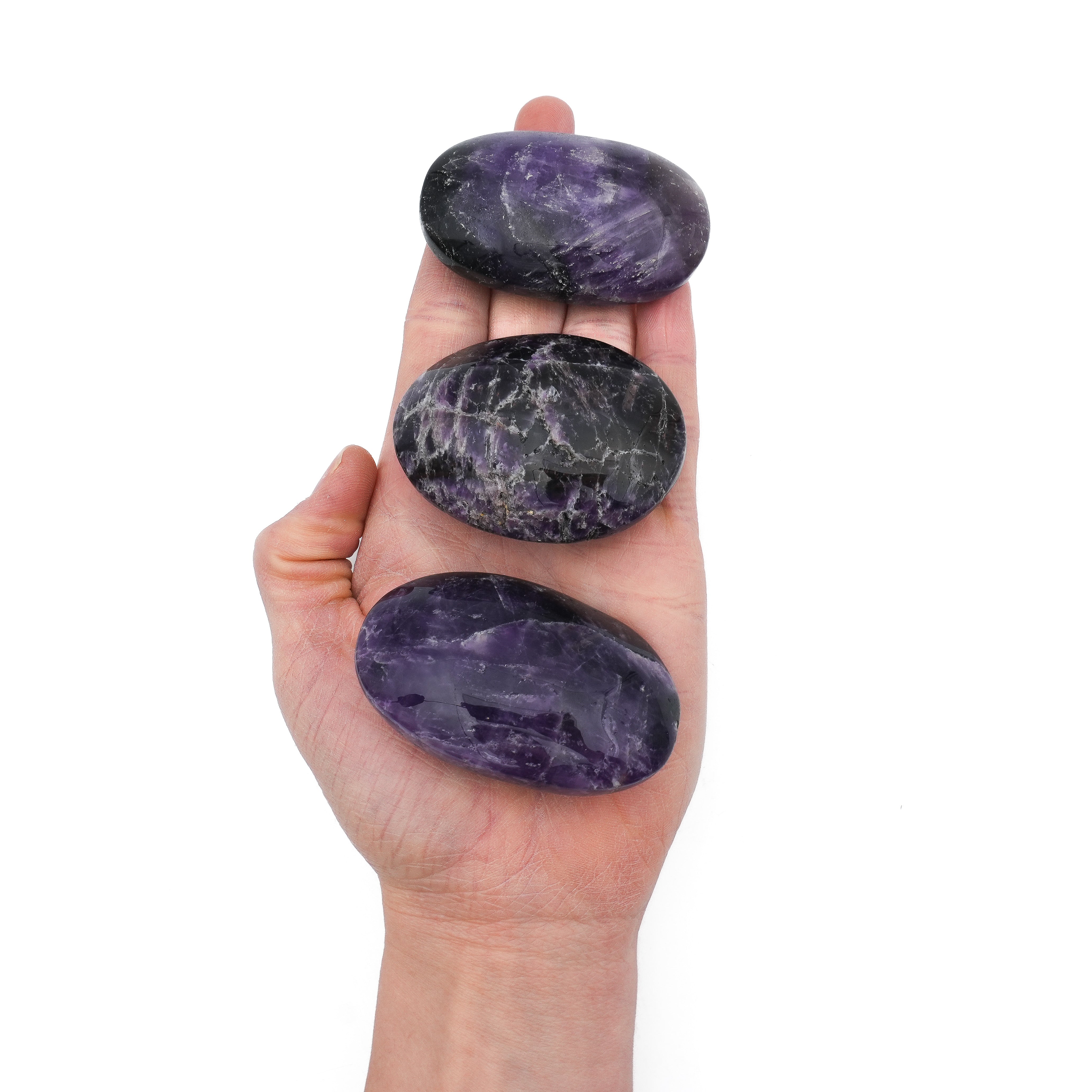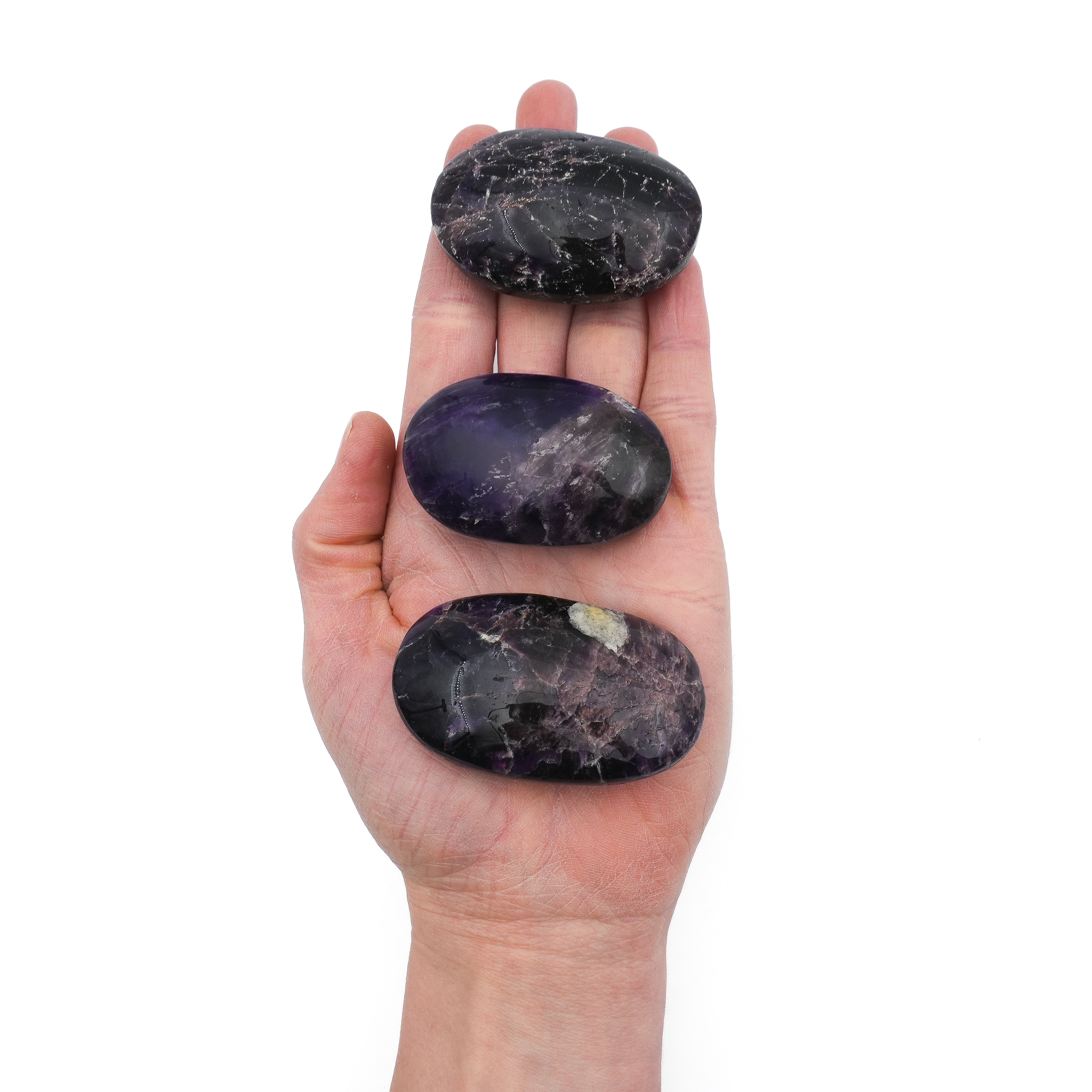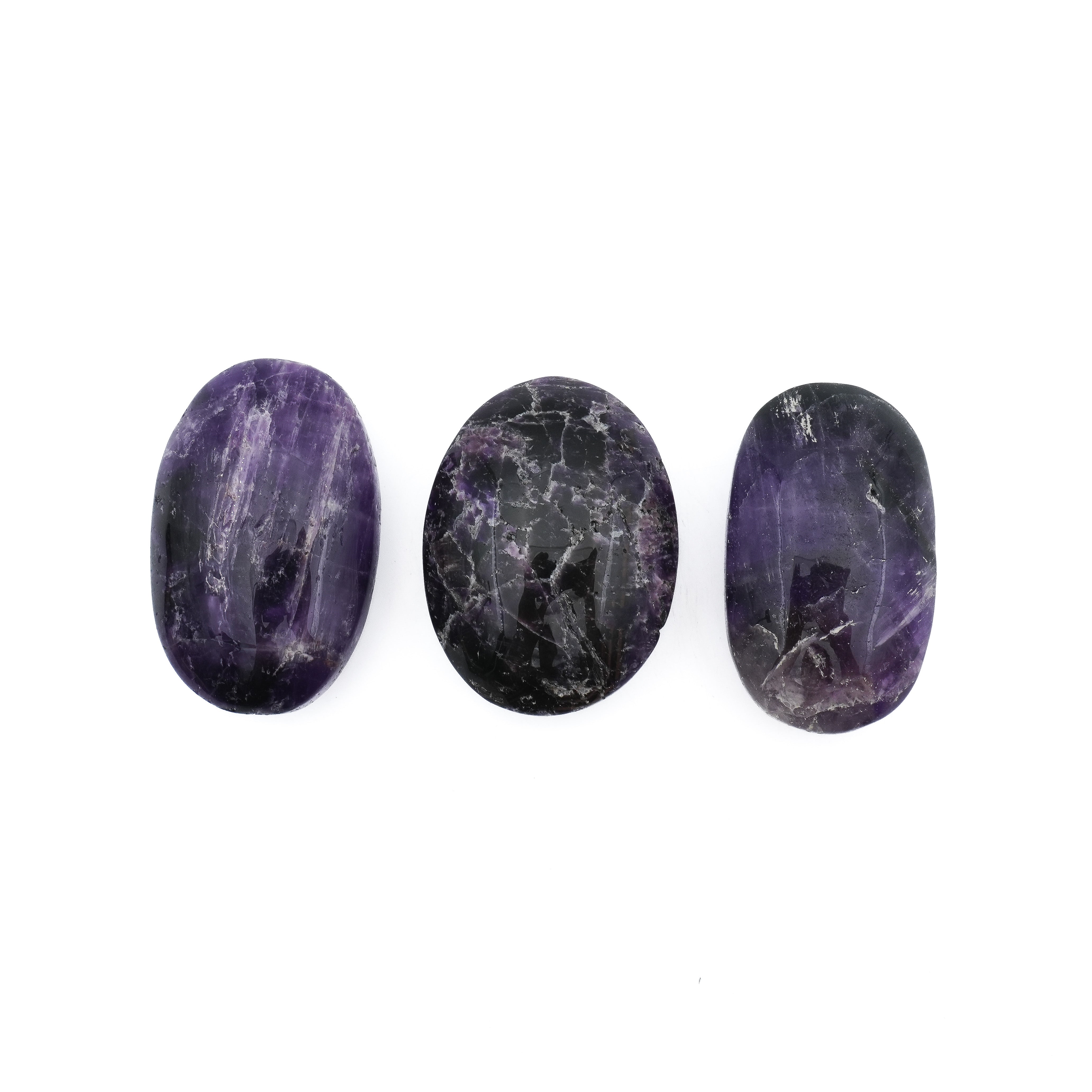 Chaque galet présente des nuances profondes de violet, souvent marquées de veinages uniques, qui en font des objets aussi esthétiques qu'efficaces. Leur forme ergonomique, douce et agréable au toucher, les rend parfaits à tenir en main lors de vos séances de relaxation.