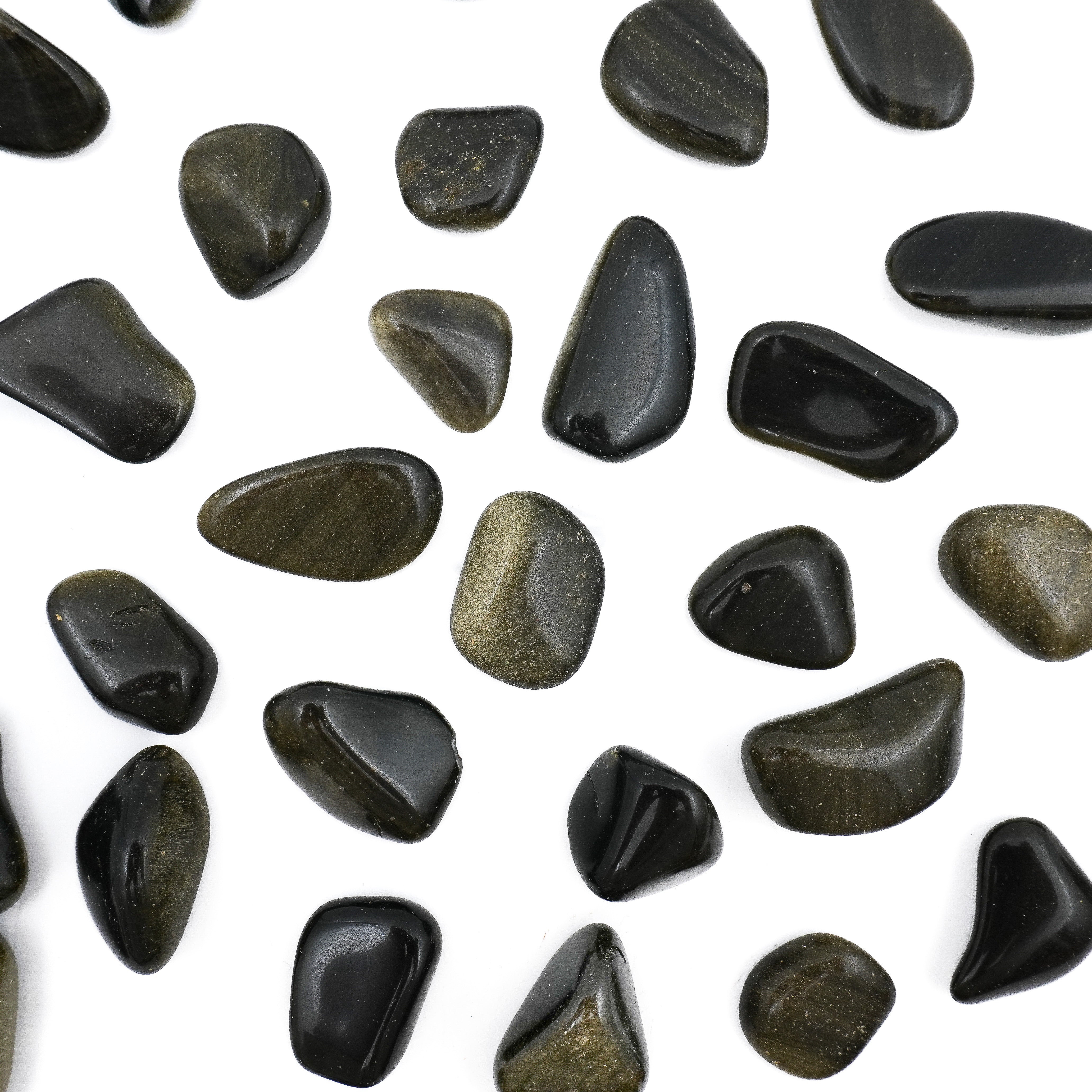 Chaque pierre est soigneusement polie pour révéler sa surface lisse et brillante, mettant en valeur des nuances de doré mêlées à un fond noir intense. Ces jeux de lumière évoquent un ciel étoilé ou des paysages de nuit éclairés par des touches dorées, faisant de chaque pièce une véritable œuvre d’art naturelle.
